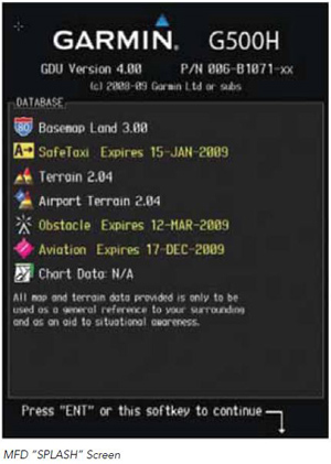 3. Apply power to the G500H System and view the MFD “Splash” screen. Check that the databases are initialized and displayed on the screen. When updating the Terrain and FliteCharts databases, an “in progress” message may be seen. If this message is present, wait for the system to finish loading before proceeding. Some databases can take up to 15 minutes to load.