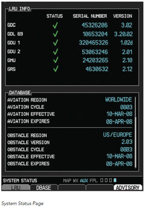 Line maintenance on the G500H system is relatively simple. The status of the system can be checked anytime the system is operating, either on the ground or in the air. The system status page, which can be called up on the MFD, displays statuses, serial numbers and software versions for all detected LRUs. If an LRU is working properly, a green checkmark is shown next to its designation. If the LRU is not working properly, a red X is shown next to its designation. The page also displays installed database information. System annunciations and alerts are displayed on the PFD and MFD.