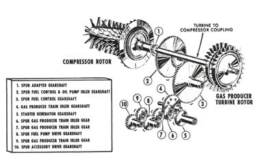 The accessories mounted externally to the gearbox and driven by the N2 gear train are the airframe furnished tachometer-generator and the power turbine speed governor. The accessories mounted externally to the gearbox and driven by the gas producer turbine (N1) at an rpm of 52,000 are the fuel pump, an airframe furnished gas producer tachometer-generator, gas producer fuel control and airframe furnished starter/generator. Internally mounted is the engine oil pump. Finally, mounted on either side of the gearbox are the compressor and turbine assemblies.