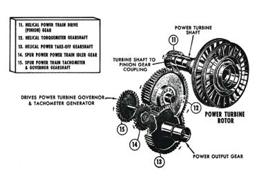 Take a look at the depiction of the N2 gear train and turbine assembly. While the N1 is churning away the N2 section is also slowly joining the party. By design, the N2 turbine wheels are turned by the energy of the expanding hot air delivered to it by the N1 gear train. The purpose of this helical gear train is to convert the kinetic energy produced by the motion of the N2 rotor to usable shaft horse power to sustain helicopter flight. This is why when you watch a RR 250 start, you hear the engine running at a higher rpm which is the N1 assembly, but see the main rotor blade rotation moving slowly at the beginning of the start sequence. Again, referring to our depiction, you can see coupled to the N2 rotor is the helical power train drive gear (pinion gear). This gear is matched to and drives the helical torque-meter gear (whose additional function we will review soon). Geared to and driven by the torque-meter gear is the helical power take off (PTO) gear. The PTO gear, as you will notice, has a straight-cut gear as part of its assembly. This drives the gear shaft, which turns the N2 governor and the N2 tach-generator.