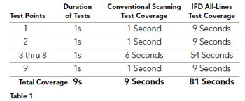 In fact, the IFD’s test coverage is actually even better than this. Scanning continuity testers take valuable test time to switch to the next circuit and in order to see ohmic glitches (rather than complete opens), they must also charge the new line sufficiently to see an ohmic change. Meanwhile, the IFD dutifully keeps watch for ohmic events on any line for the entire duration.