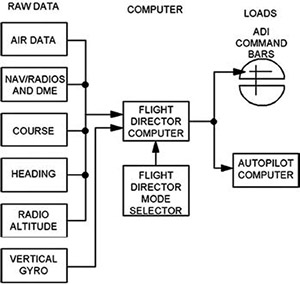 The sensors provide the raw data to be processed by the computer. The flight director mode selector (controller) tells the computer which raw data to use, depending on pilot mode preference. The computer processes the raw data and gain scales the information to be displayed on the ADI/EADI command bars and/or to the autopilot.